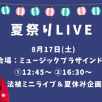 2024年8月8日 / 最終更新日時 : 2024年8月10日 博多ORIHIME NEWS 8/17(土) 夏祭りLIVE 『夏祭りLIVE』開催日:2024年8月17日(土)会場:新天町ミュージックプラザINDO (福岡市中央区天神2丁目8-234 2F)1部:開場12:30/開演12:452部:開場16:15/開演16:30 ・ライブ中は […]