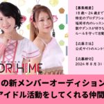 2024年8月6日 / 最終更新日時 : 2024年9月1日 博多ORIHIME NEWS 新メンバーオーディション開催のお知らせ 博多ORIHIMEが3年ぶりの新メンバーオーディションを開催!一緒に歌って踊って、福岡でアイドル活動をしてくれる仲間を募集します! 【募集概要】18歳~24歳までの女性特定のプロダクションと契約していない方福岡市内のレッ […]